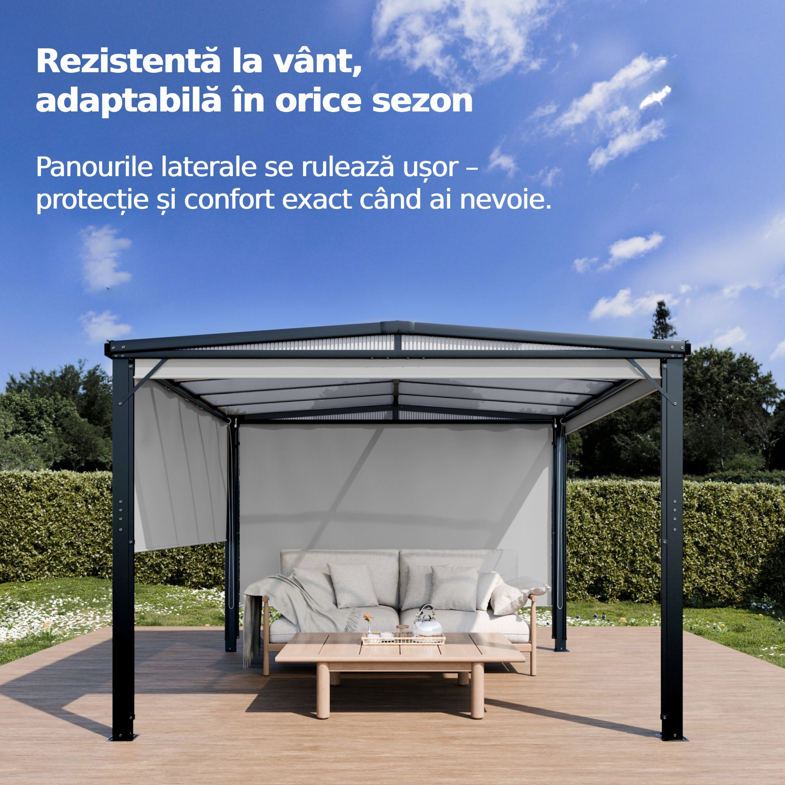 Toți cei 4 pereți laterali sunt echipați cu rulouri retractabile din material textil poliester, oferind intimitate, protecție împotriva vântului sau a razelor solare în funcție de nevoi. Poți regla cu ușurință fiecare panou în sus sau în jos.