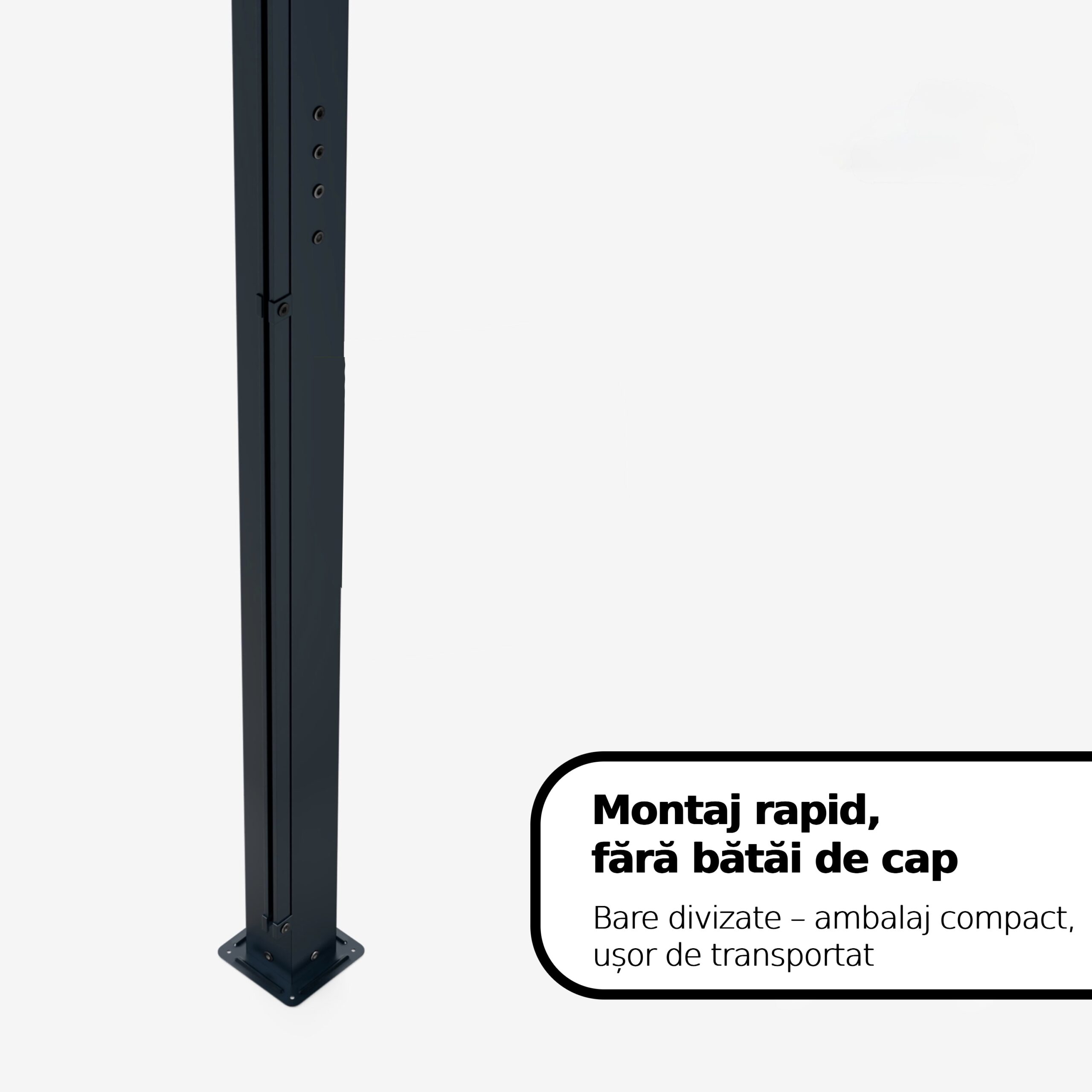 Pergola se poate monta rapid pe o suprafață solidă cu pini de fixare sau cu șuruburi. Pachetul include toate accesoriile necesare pentru o instalare completă și sigură.