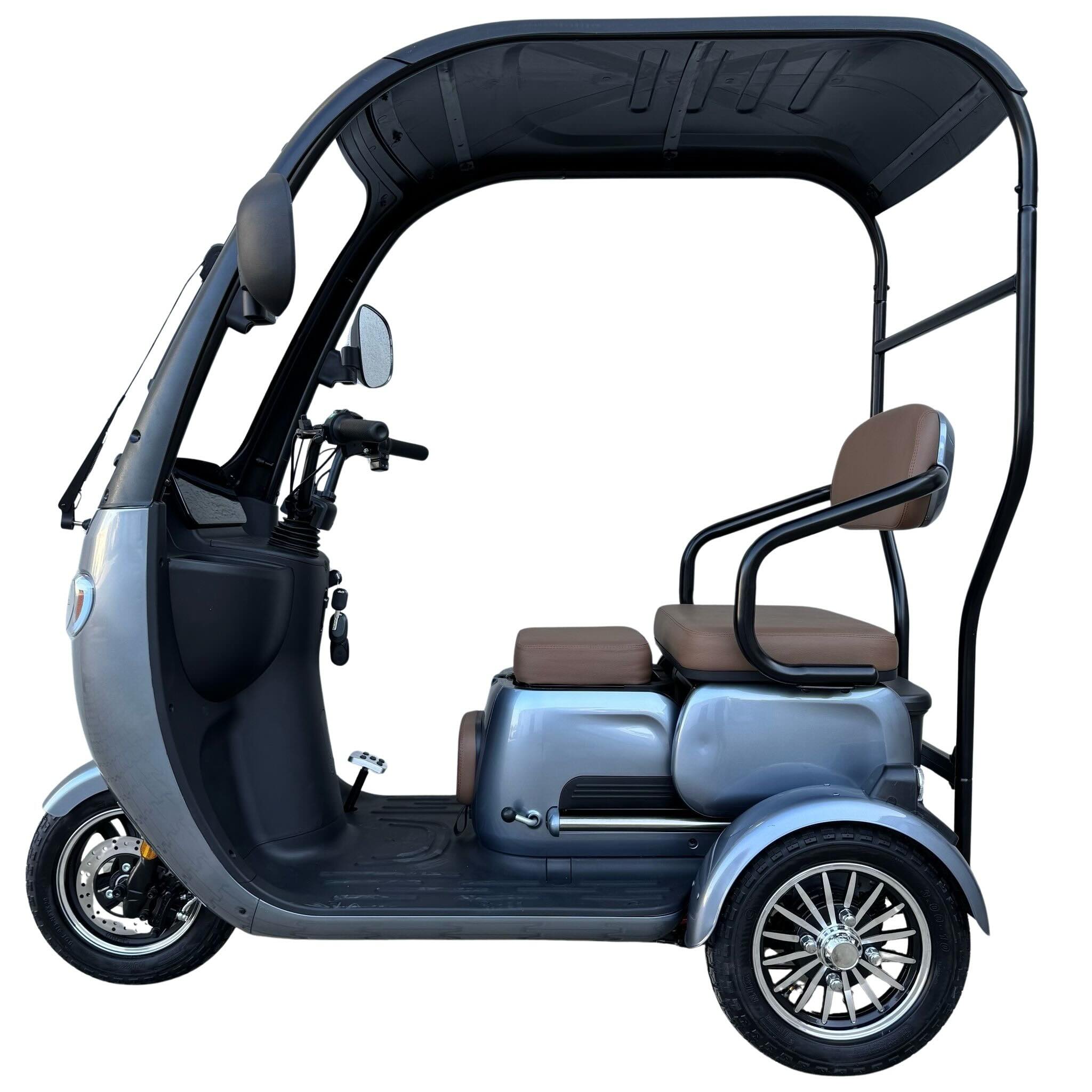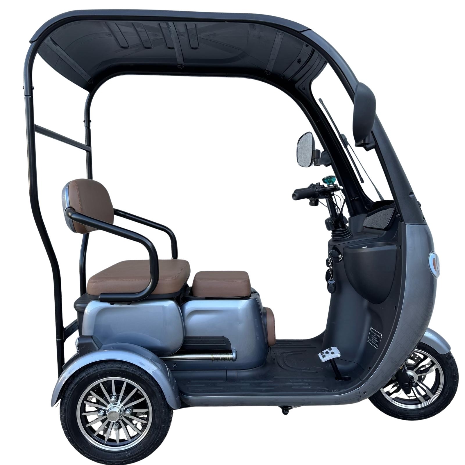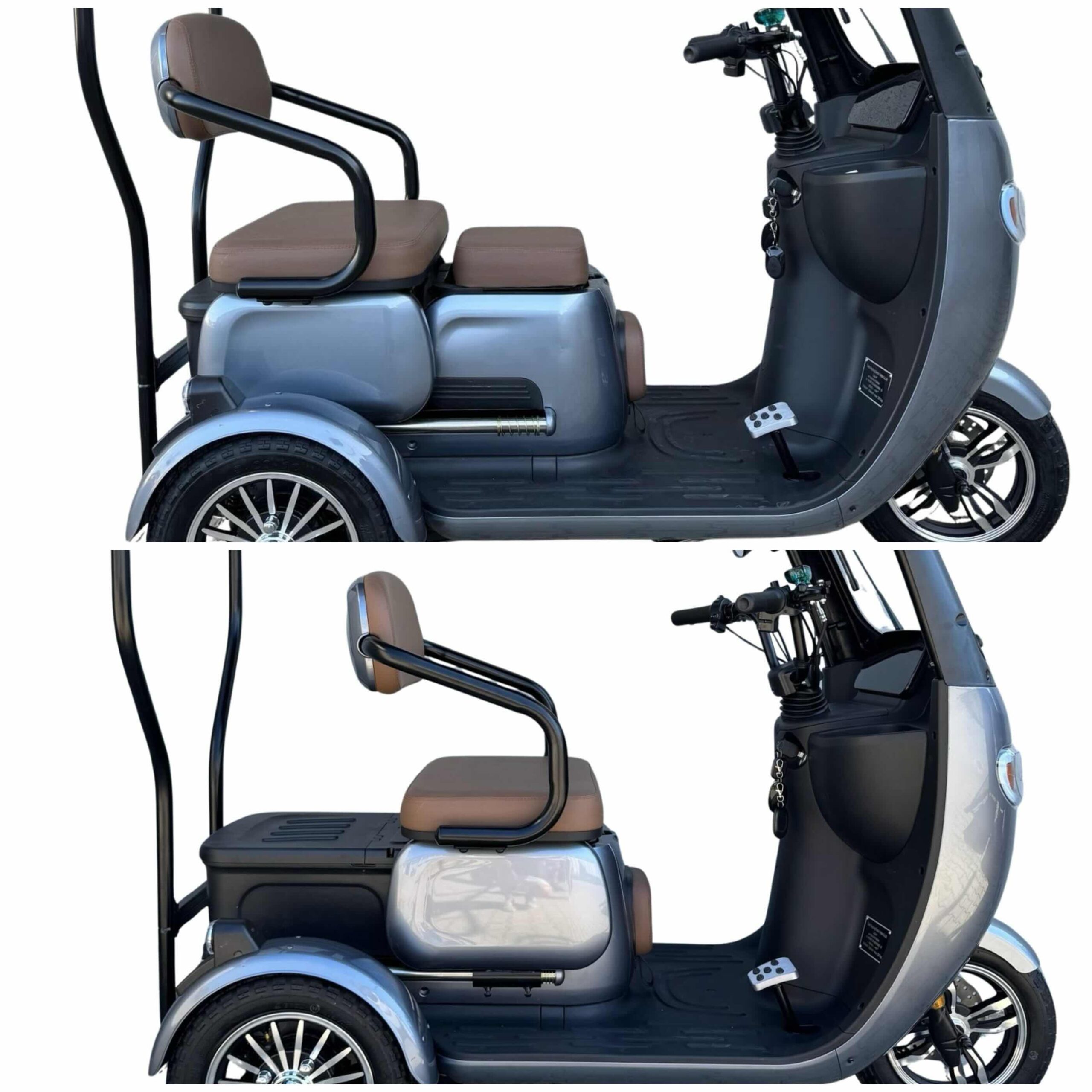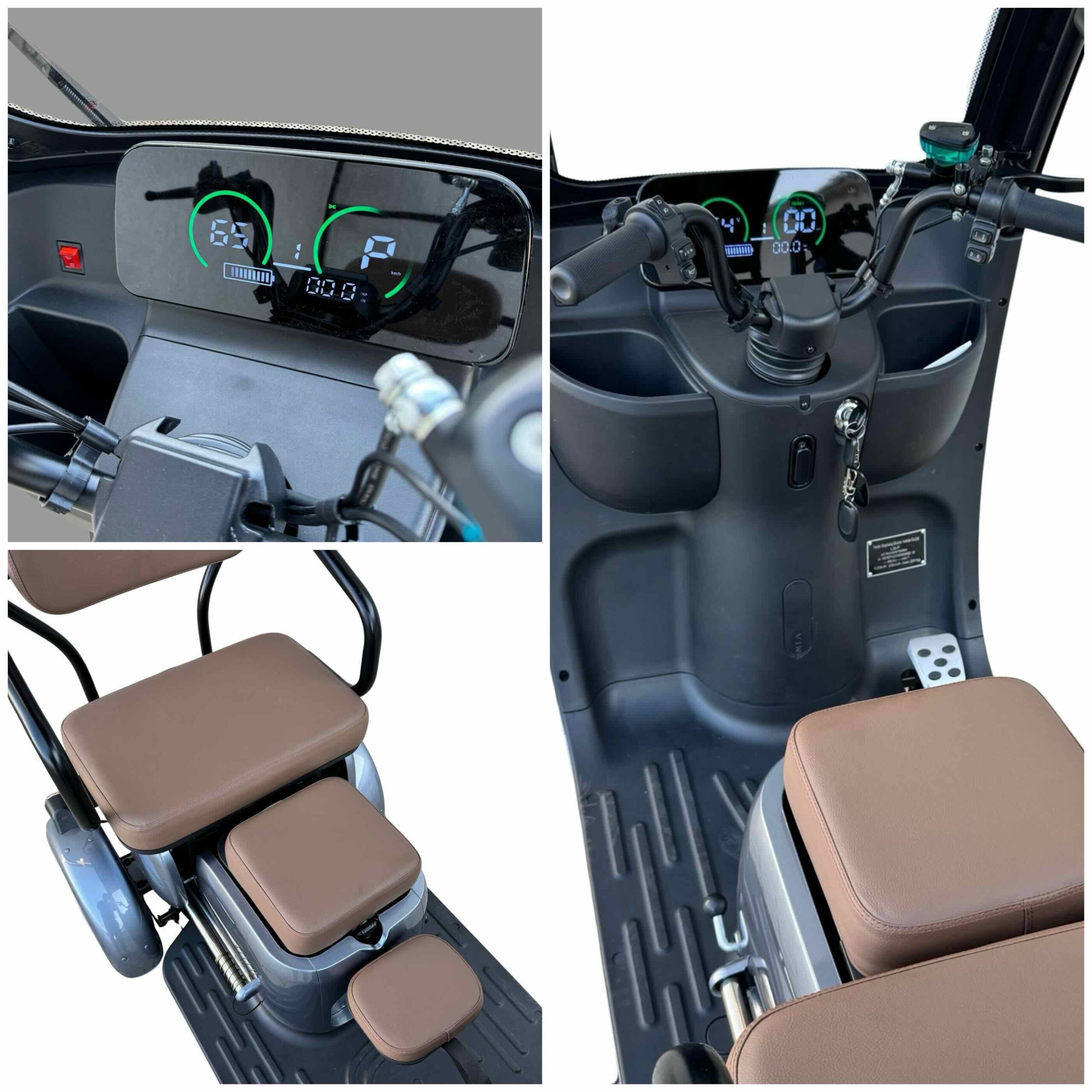 Tricicletă electrică practică și confortabilă, ideală pentru transportul a două persoane și diverse bunuri, cu viteză maximă limitată la 25 km/h – ceea ce înseamnă că nu necesită permis de conducere. Este echipată cu acoperiș și parbriz, oferind protecție suplimentară împotriva soarelui, ploii și vântului, și dispune de multiple spații de depozitare pentru un plus de utilitate.