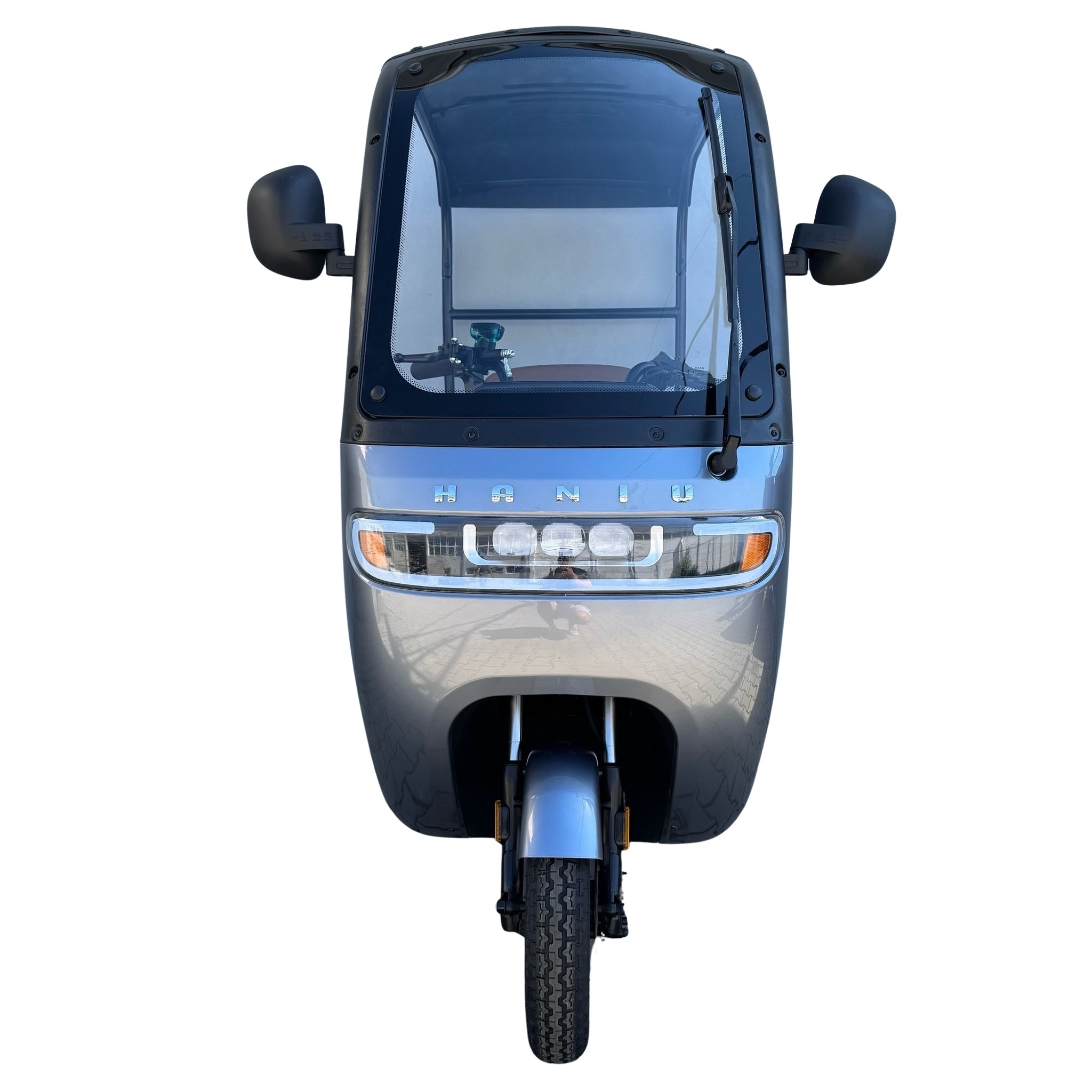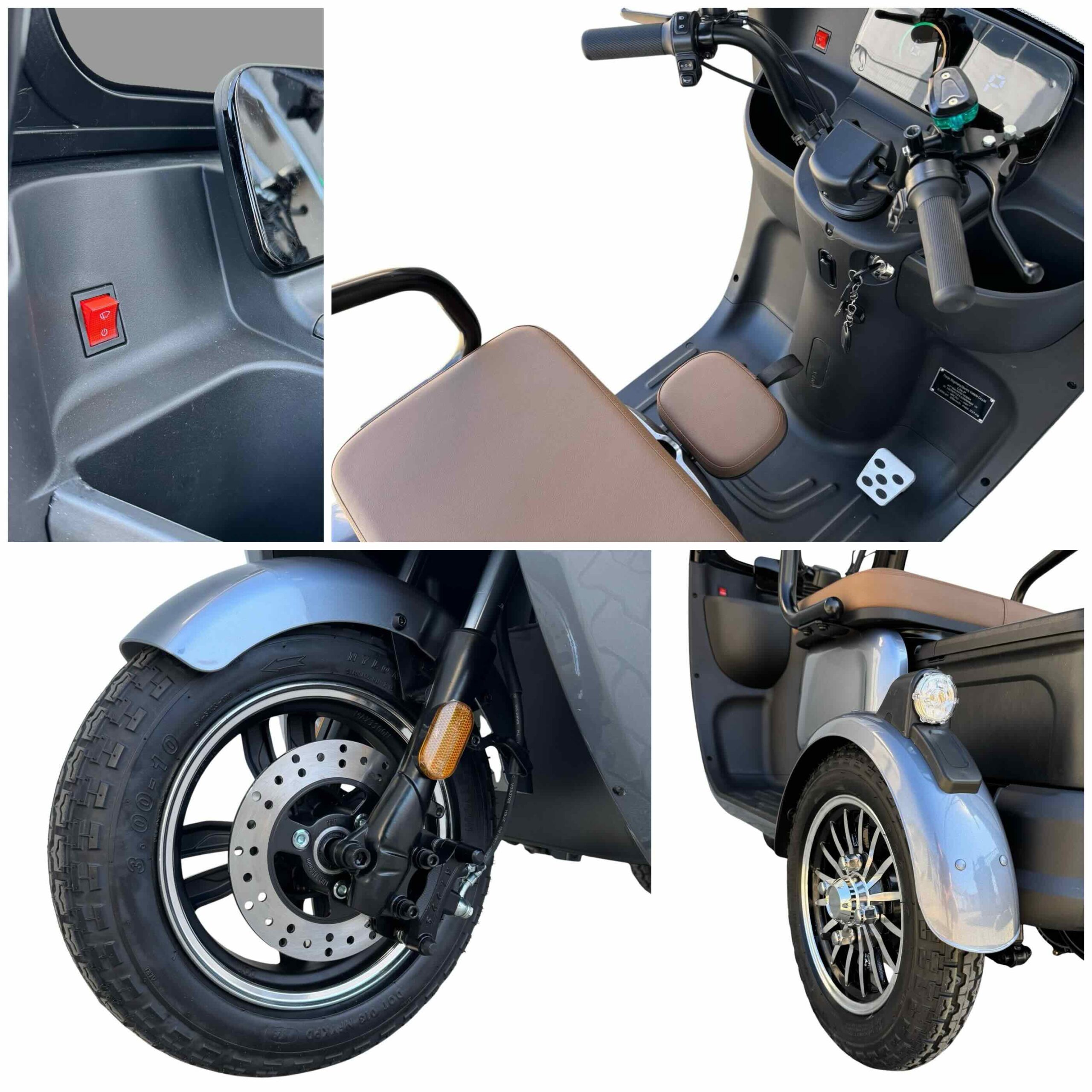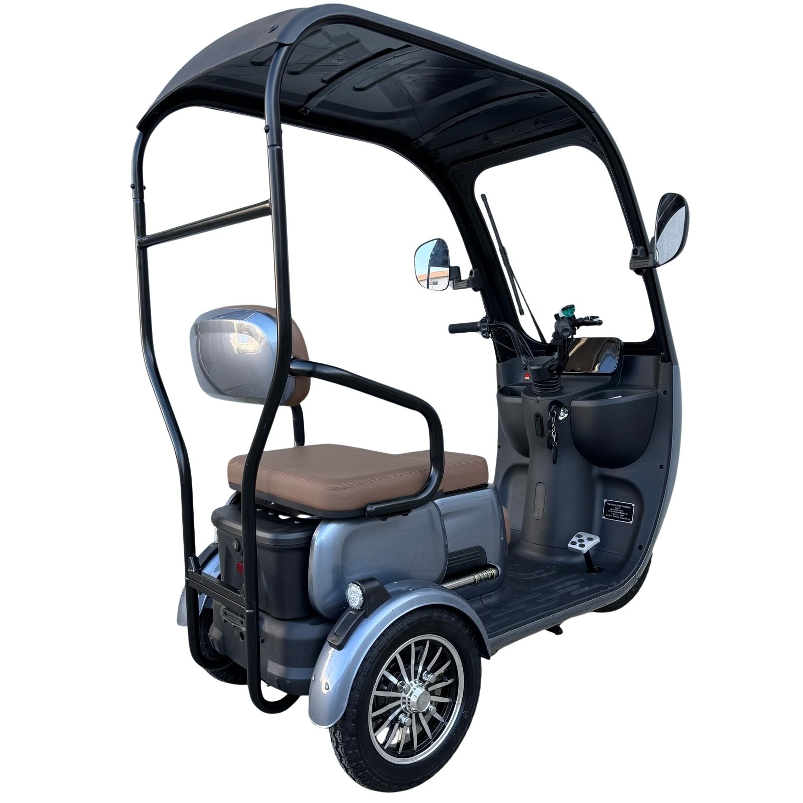 Tricicletă electrică practică și confortabilă, ideală pentru transportul a două persoane și diverse bunuri, cu viteză maximă limitată la 25 km/h – ceea ce înseamnă că nu necesită permis de conducere. Este echipată cu acoperiș și parbriz, oferind protecție suplimentară împotriva soarelui, ploii și vântului, și dispune de multiple spații de depozitare pentru un plus de utilitate.