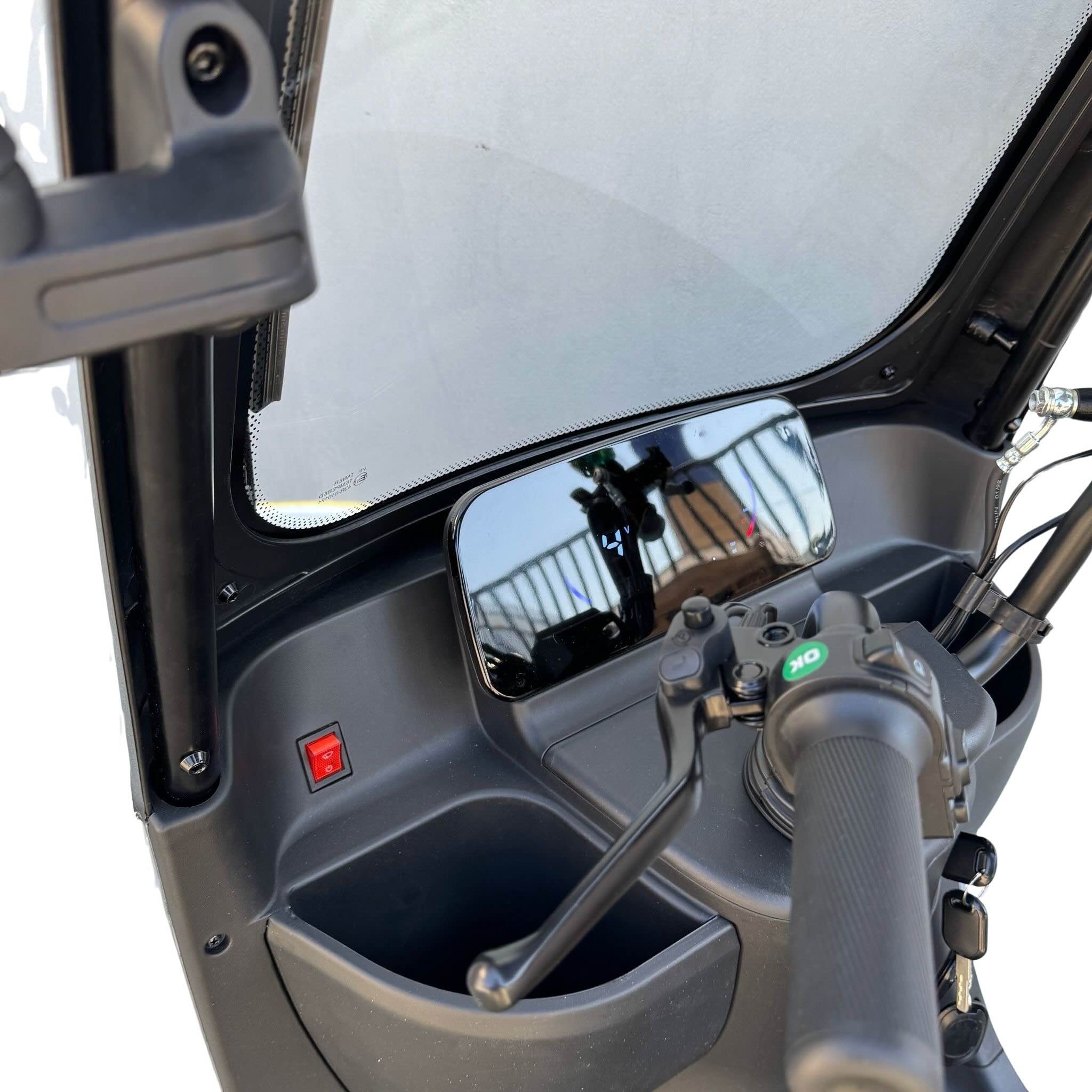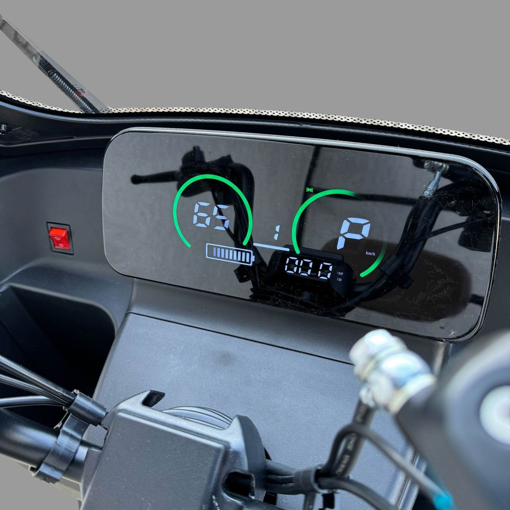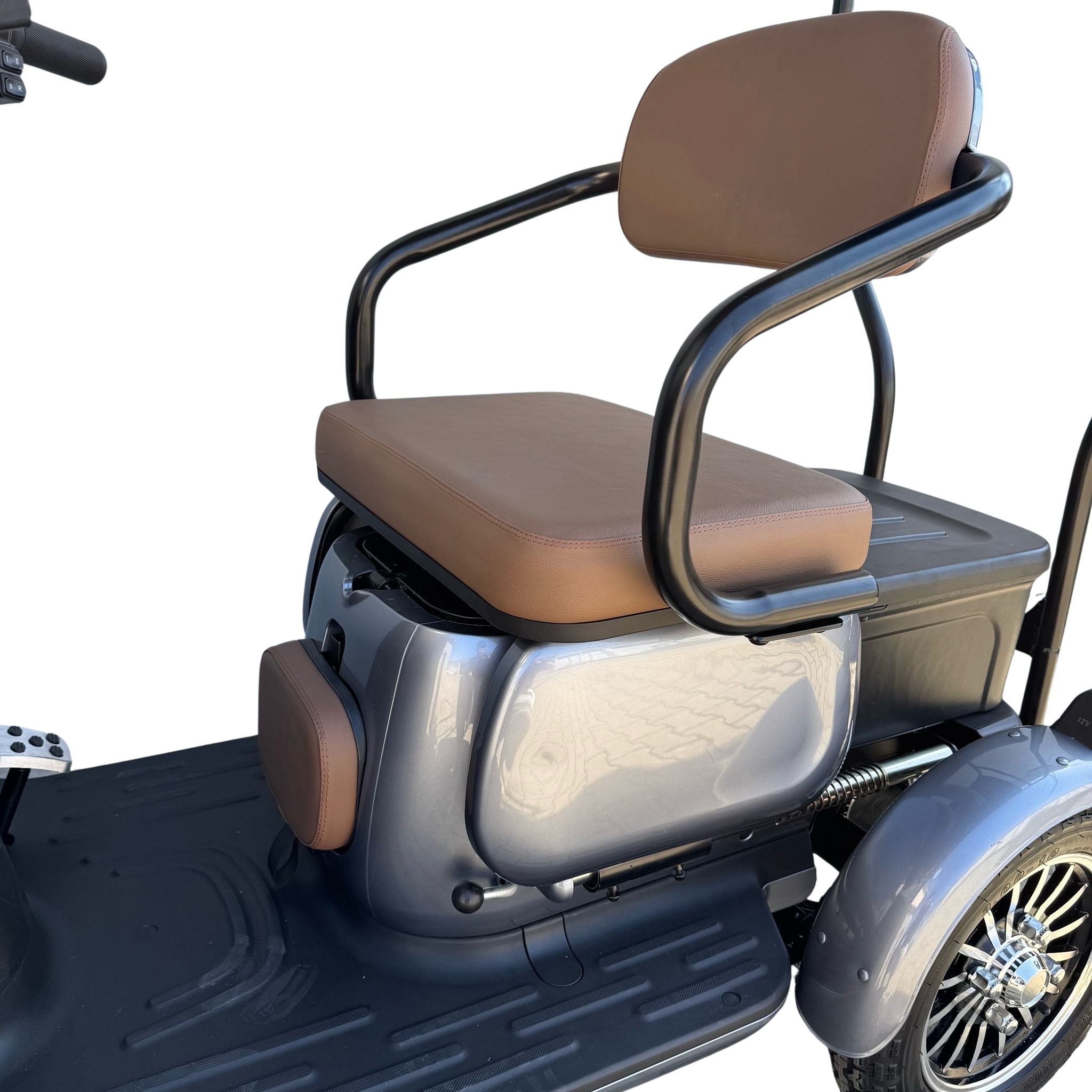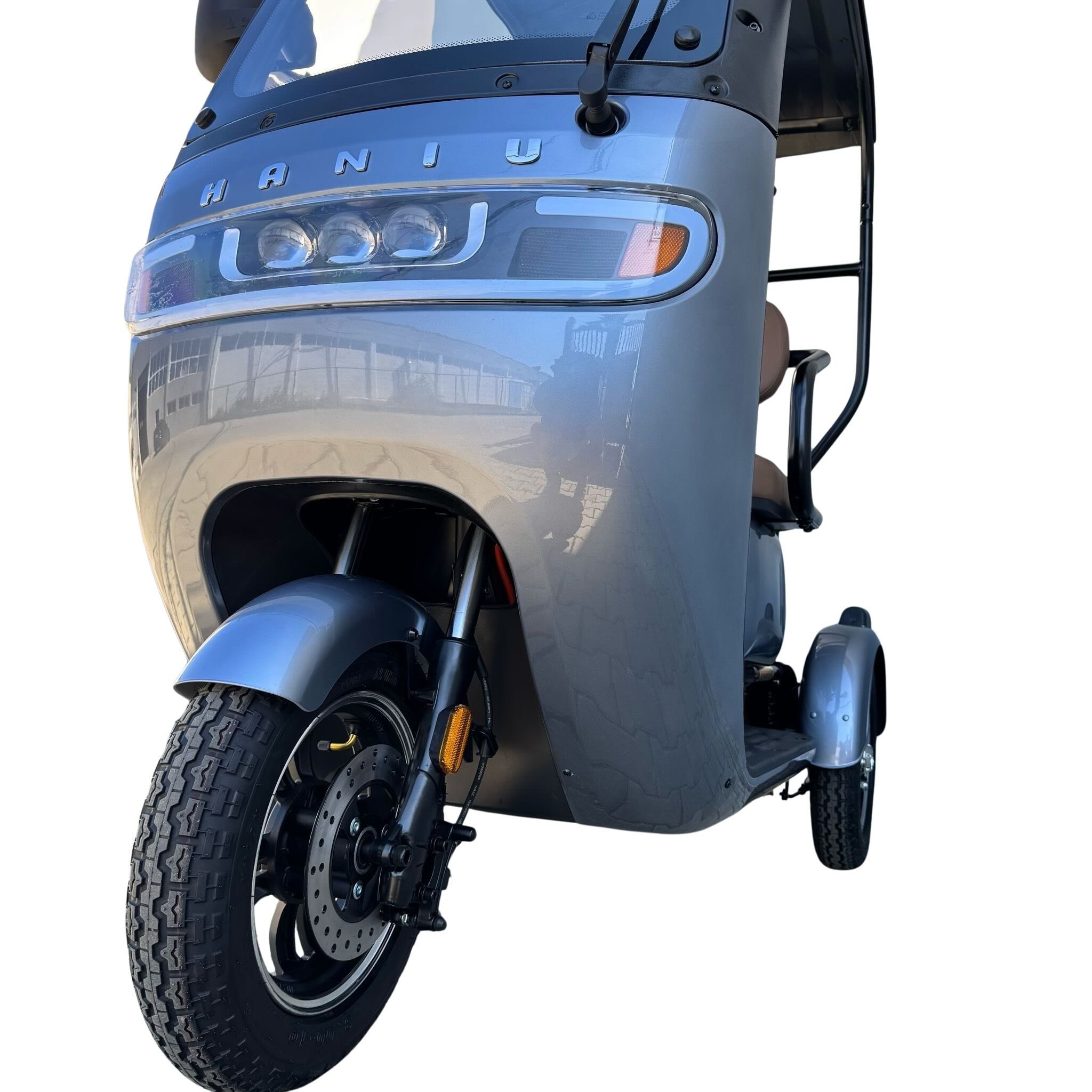 Tricicletă electrică practică și confortabilă, ideală pentru transportul a două persoane și diverse bunuri, cu viteză maximă limitată la 25 km/h – ceea ce înseamnă că nu necesită permis de conducere. Este echipată cu acoperiș și parbriz, oferind protecție suplimentară împotriva soarelui, ploii și vântului, și dispune de multiple spații de depozitare pentru un plus de utilitate.